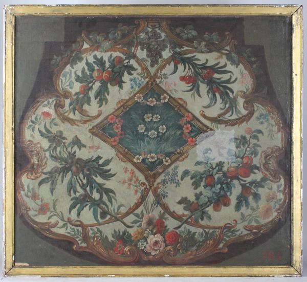 Sur un fond blanc gris se détachent des branches de fruits et des feuilles encadrant un losange décoré de fleurs. Encadrement chantourné or : motif de fleurs à la base.