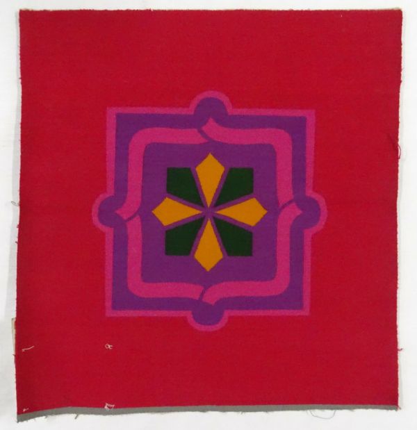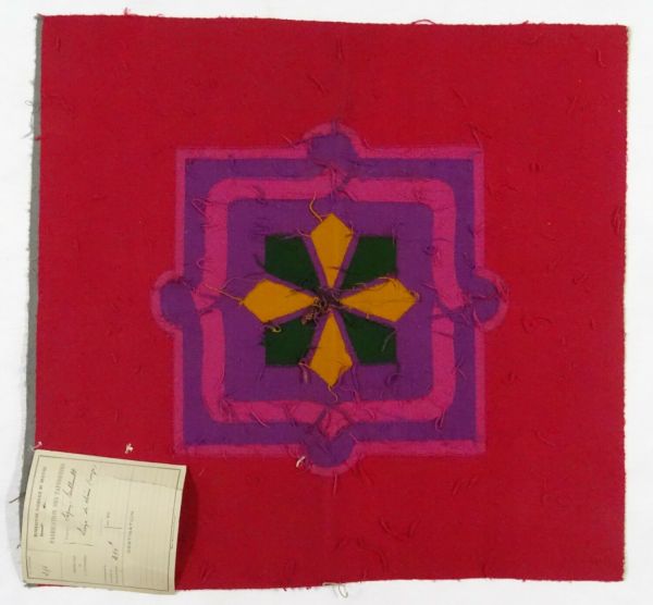 Motif de rosace géométrique et carrée jaune, verte, lilas, rose, le tout sur fond rouge framboise.