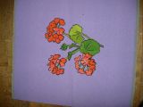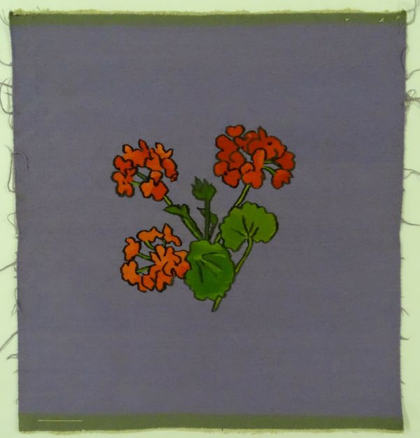 - Assise de chaise. Décor : sur fond violet, trois géraniums. Bordures vert-gris en haut et en bas.