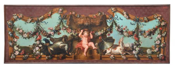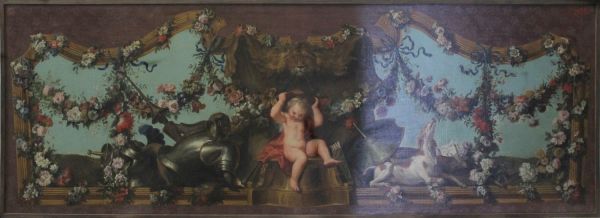 Modèle pour le dossier d’un canapé destiné à accompagner la seconde tenture de L’Histoire de Don Quichotte (Rome, palais du Quirinal ; Naples, musée de Capodimonte, Coll. Part.), dont le tissage fut ordonné aux Gobelins par le duc d’Antin en 1719. Le carton est cité dans l’"État des ouvrages de peinture faits pour le roy de 1716 à 1729" : « Un tableau représentant un Amour ayant en tête l’armet de Mambrin, suite de la même Histoire de Dom Quichotte… 235 livres » (Archives nationales, O/1/1921/A/, fol. 3 verso, cité dans Fenaille, 1923, p. 161). Il s’agit d’un exemple précoce de tissage de tapisseries d’ameublement sur métiers de basse-lisse.