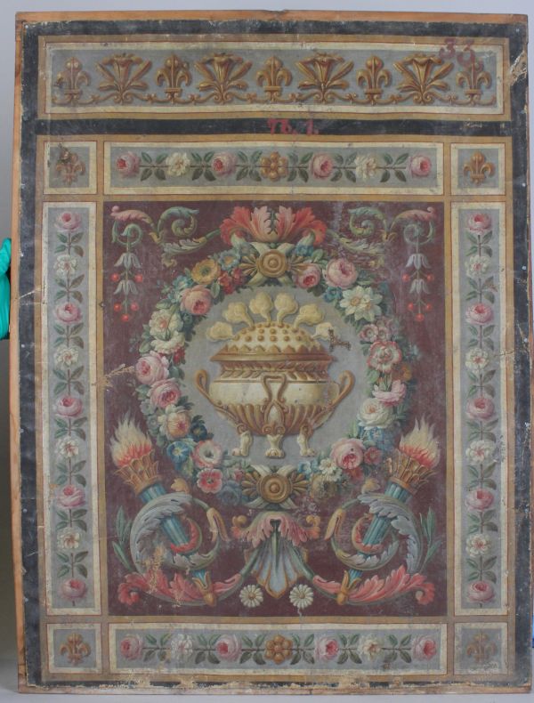 Médaillon à fond gris décoré d'une cassolette dans une couronne de fleurs variées. Fond général marron à décor de culots et de rinceaux. Plates-bandes à fond gris décorées de guirlandes de roses. À la partie supérieure : frise de culots et fleurs de lys or, sur fond gris.