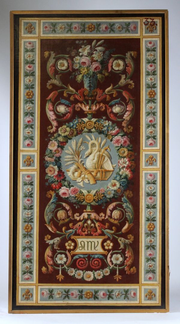 Carton pour feuille de paravent. Fond rouge centré par une couronne de fleurs colorées au sein de laquelle s'ébat dans un bassin, entouré de roseaux et gerbes de blé. En haut et en bas de la couronne se déploient des rinceaux d'acanthe se terminant en volutes, d'où émerge un bouquet en partie supérieure de la composition, et un cartouche avec les signes du zodiaque des gémeaux et du cancer en partie inférieure. L'ensemble du tableau est encadré par une frise de fleurs dans des caissons rectangulaires, séparés par des fleurs de lys. A l'avers, dans l'angle supérieur droit, indication du numéro du meuble tissé, à la peinture rouge : « 33. »