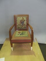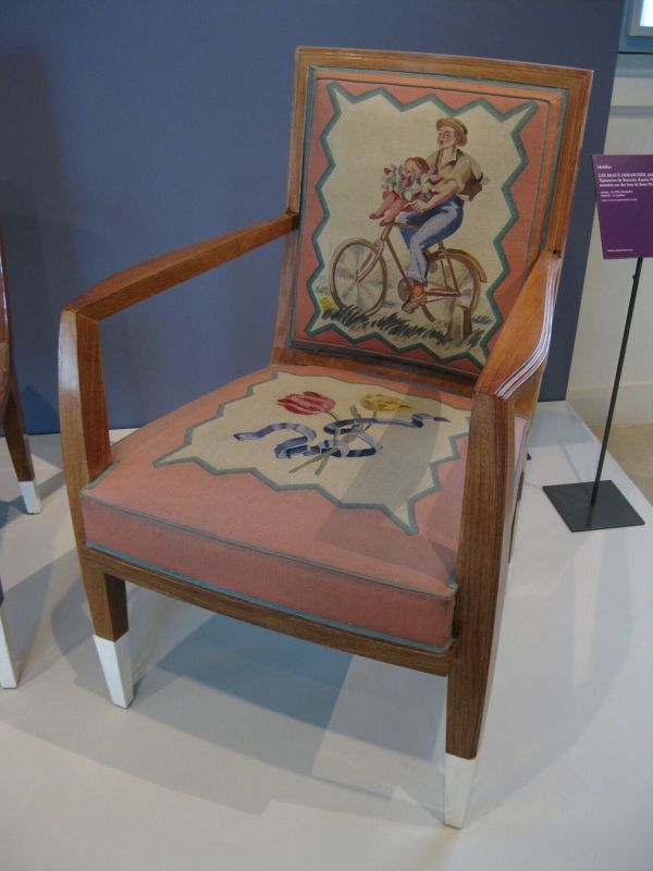 Pieds antérieurs et supports d'accotoirs en gaine à sabots ivoirine. Pieds postérieurs sabre. Devanture légèrement convexe, débordante. Accotoirs plats carrés. Dossier carré, mouluré. Garniture à épaisseur et à ressorts. Couverture : tapisserie de Beauvais : tulipes et sports sur fond crème, encadrement saumon. Listel dents de scie intermédiaire. Au dossier "Le Cycliste".