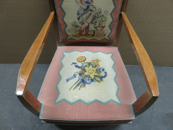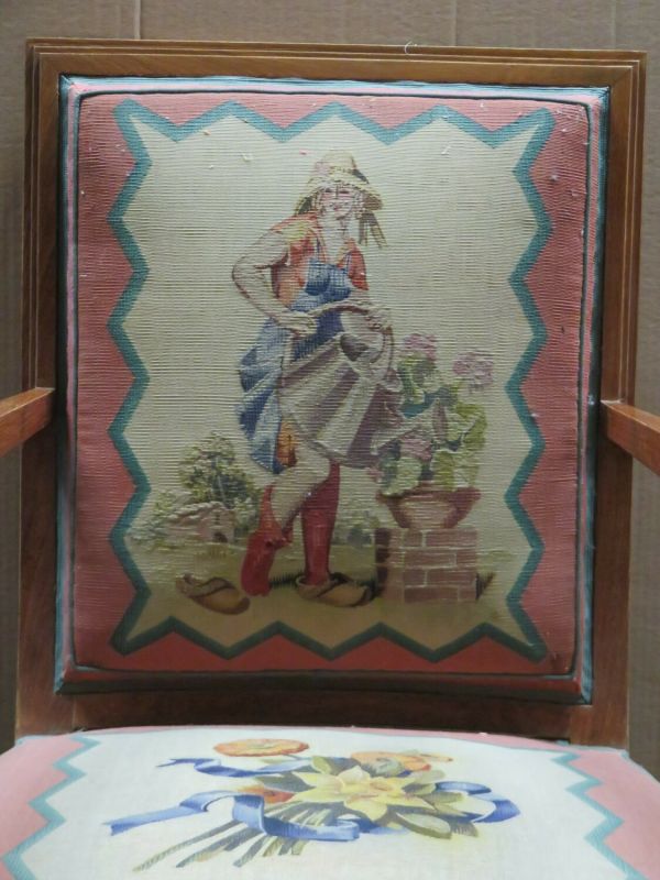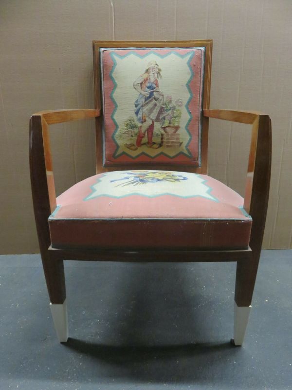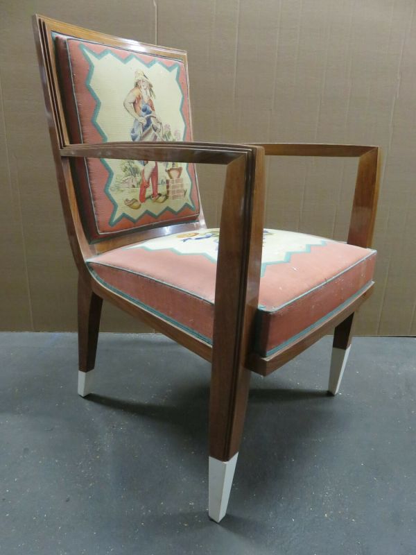 Pieds antérieurs et supports d'accotoirs en gaine à sabots ivoirine. Pieds postérieurs sabre. Devanture légèrement convexe, débordante. Accotoirs plats carrés. Dossier carré, mouluré. Garniture à épaisseur et à ressorts. Couverture : tapisserie de Beauvais : tulipes et sports sur fond crème, encadrement saumon. Listel dents de scie intermédiaire. Au dossier "Le Jardinier".
