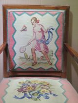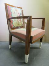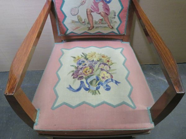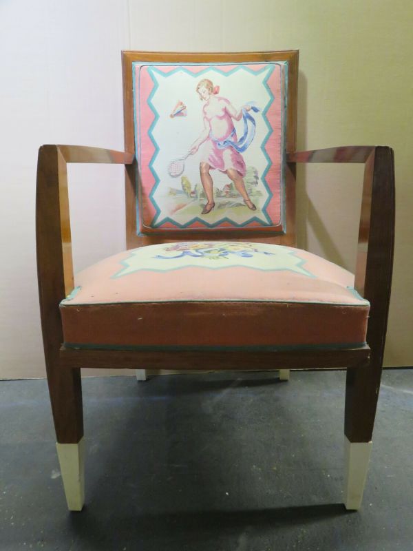 Pieds antérieurs et supports d'accotoirs en gaine à sabots ivoirine. Pieds postérieurs sabre. Devanture légèrement convexe, débordante. Accotoirs plats carrés. Dossier carré, mouluré. Garniture à épaisseur et à ressorts. Couverture : tapisserie de Beauvais : tulipes et sports sur fond crème, encadrement saumon. Listel dents de scie intermédiaire. Au dossier "La Raquette".