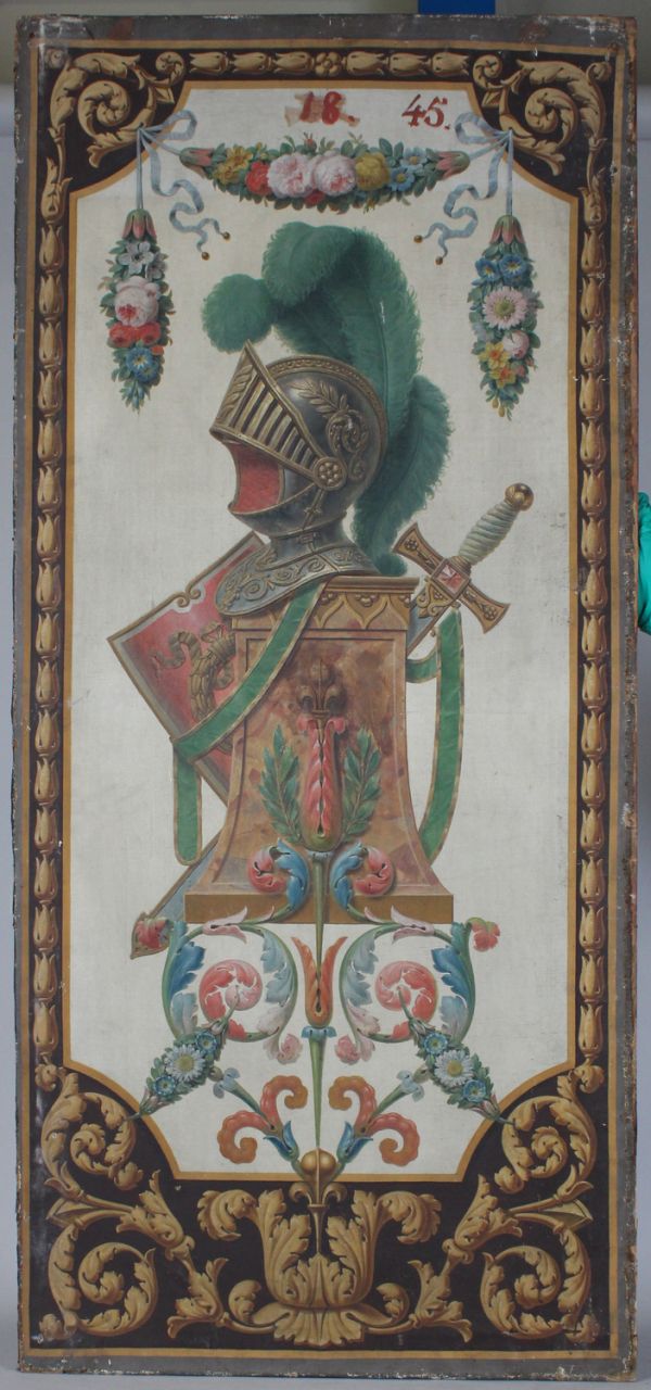 Modèle assez proche du paravent issu d'un 'Meuble pour le Salon de Monsieur à Fontainebleau'. Des différences au niveau du casque et des armes.