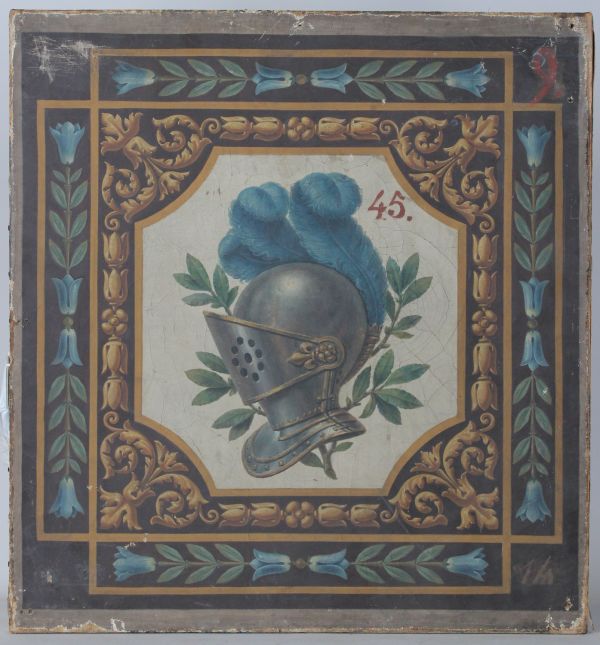 Dossier. Fiche cartonnée : 'Sur un fond blanc se détache un casque à cimier bleu. Contrefond marron décoré de culots et de rinceaux or. Plates-bandes à feuilles vertes et culots bleus.'.