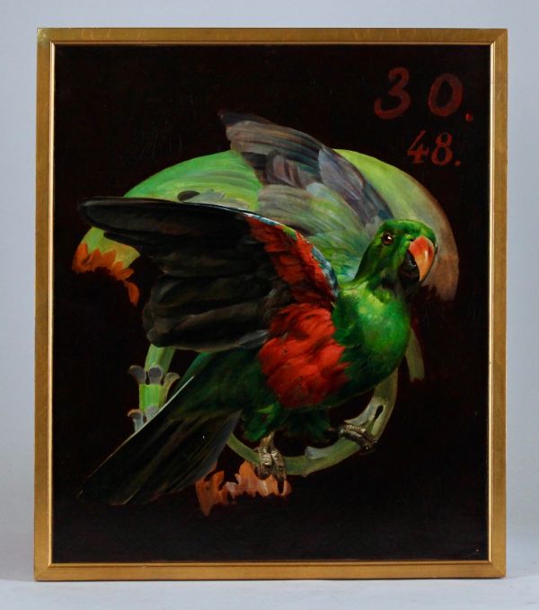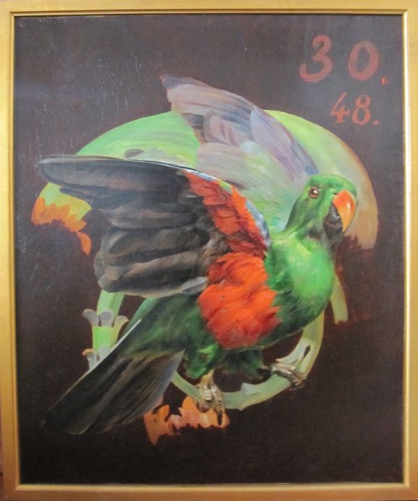 Modèle pour le Meuble aux oiseaux présentant un perroquet eclectus femelle.