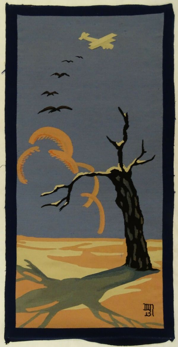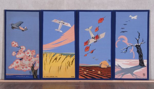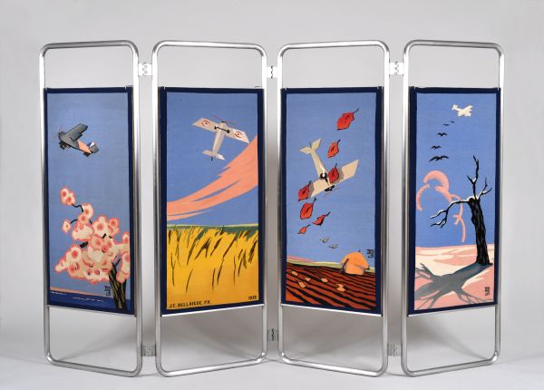 Du meuble n° 50 de la manufacture de Beauvais, "Les Avions", tissé entre 1927 et 1930 d'après les cartons de Jean-Camille Bellaigue, puis monté sur une structure métallique dessinée par Djo Bourgeois et fabriquée par Thonet. Le meuble, composé d'un paravent, trois fauteuils et une chaise, fut dépecé en 1953 et la structure métallique cédée aux Domaines. L'ensemble fut reconstitué, d'après des photographies, en 2020 pour le paravent (GMT 35402) et en 2025 pour les trois fauteuils (GMT 35399, 35400 et 35401).