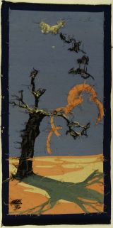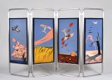 Feuille de paravent. Décor : Les avions l'hiver, sur fond bleu un avion blanc et des corbeaux survolent un champ enneigé au milieu duquel se détache un arbre dénudé.