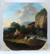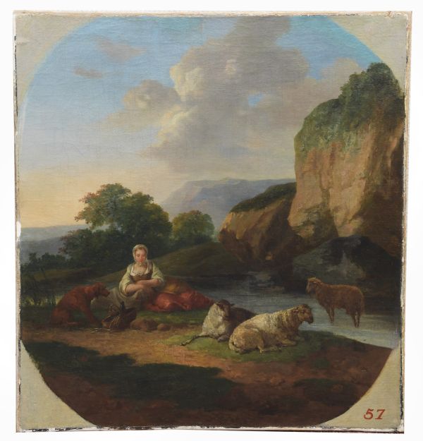 Sur un fond de rochers, une bergère couchée vêtue en rouge. Une chèvre dans l'eau. Un chien et deux moutons couchés.