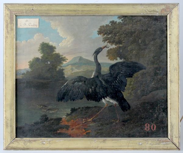 Un héron debout le long d'une rivière ; arbres à droite. Au fond une montagne.. Fable de La Fontaine, livre VII, fable 4 : ' Un jour sur ses longs pieds allait je ne sais où / Le Héron au long bec emmanché d’un long cou. / Il côtoyait une rivière. / L’onde était transparente ainsi qu’aux plus beaux jours ; / Ma commère la Carpe y faisait mille tours / Avec le Brochet son compère. / Le Héron en eût fait aisément son profit : / Tous approchaient du bord, l’Oiseau n’avait qu’à prendre ; / Mais il crut mieux faire d’attendre / Qu’il eût un peu plus d’appétit. / Il vivait de régime, et mangeait à ses heures. / Après quelques moments l’appétit vint ; l’Oiseau / S’approchant du bord vit sur l’eau / Des Tanches qui sortaient du fond de ces demeures. / Le mets ne lui plut pas ; il s’attendait à mieux, / Et montrait un goût dédaigneux / Comme le Rat du bon Horace. / Moi des Tanches ? dit-il, moi Héron que je fasse. Une si pauvre chère ? Et pour qui me prend-on ? / La Tanche rebutée (2), il trouva du Goujon. / Du Goujon ! c’est bien là le dîné d’un Héron ! / J’ouvrirais pour si peu le bec ! aux Dieux ne plaise ! / Il l’ouvrit pour bien moins : tout alla de façon / Qu’il ne vit plus aucun Poisson. / La faim le prit ; il fut tout heureux et tout aise / De rencontrer un Limaçon.