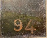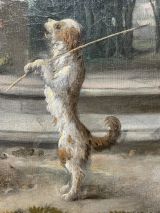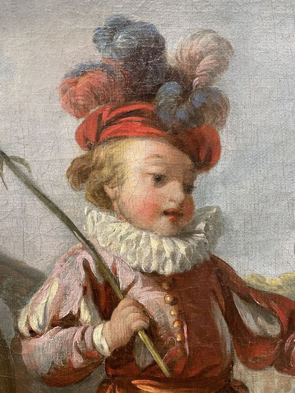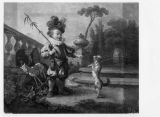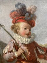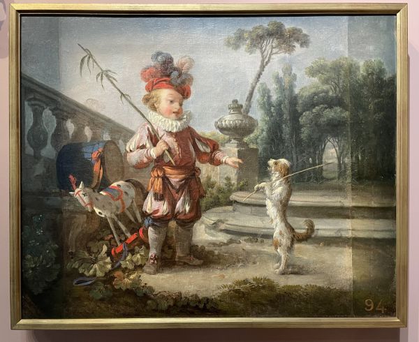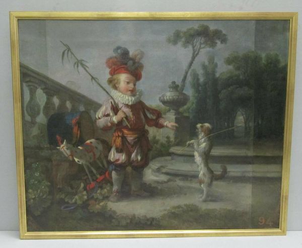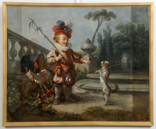 Un enfant porte un chapeau empanaché de plumes, une veste à crevés et une culotte bleue. Devant lui, un chien dressé sur ses pattes arrière attend une récompense. Tambour, cheval. Fond d'arbres. 2 marches d'escalier. Un vase sur une stèle.