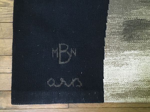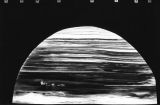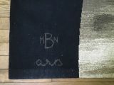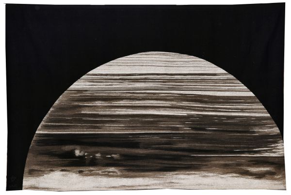 Sur un fond noir se détache un demi cercle, décoré de lignes parallèles chinées marrons noirs et argent. Encadrement à fond noir.