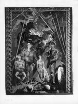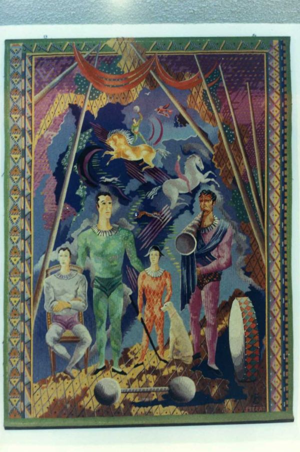 Un groupe de saltimbanques en maillots de couleurs, avec accessoires au premier plan, encadré par draperies relevées par des perches, se détache sur un fond de cirque bleuté où évoluent des cavaliers. Encadrement de bordures à dessins géométriques de couleurs variées, serties d'un petit galon vert.