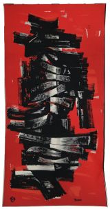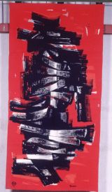 Sur un fond rouge se détachent des motifs horizontaux noirs chinés de gris, comme des coups de pinceau.