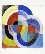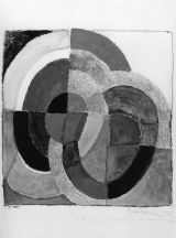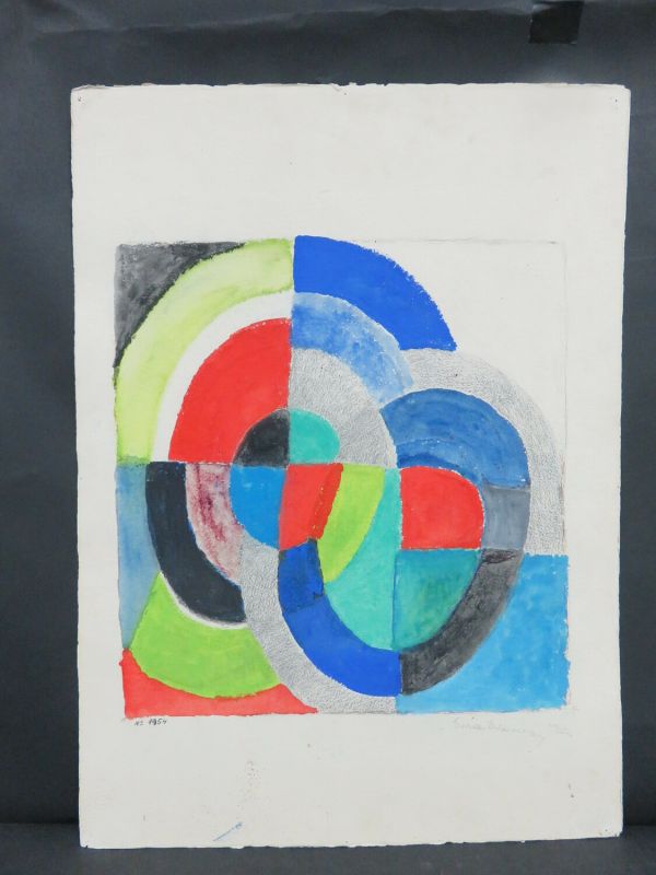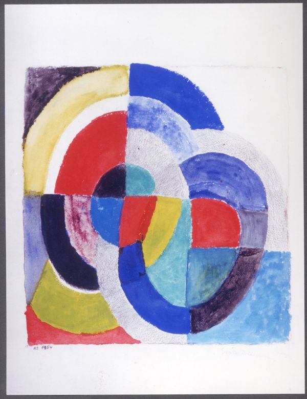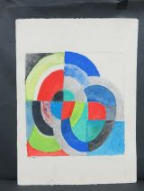 Gouache composition géométrique circulaire de couleur vives. Format carré qui accueille des anneaux dédoublés en 8 où les carrés viennent s'inscrire afin d'en changer les couleurs.