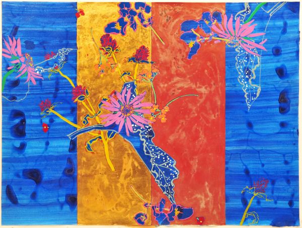 acrylique, feuille d'or, mica sur papier japonais datée de 2011, signé au dos " 2011-17 Robert Kushner Summer Scattered "