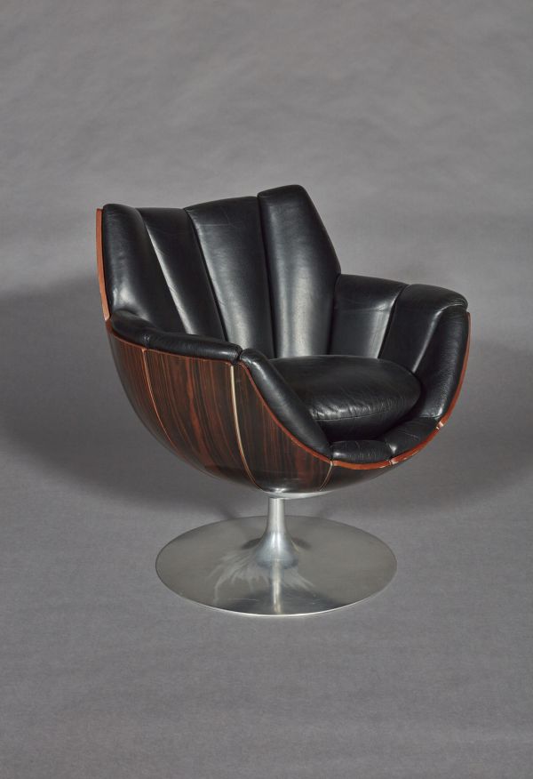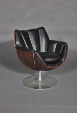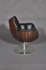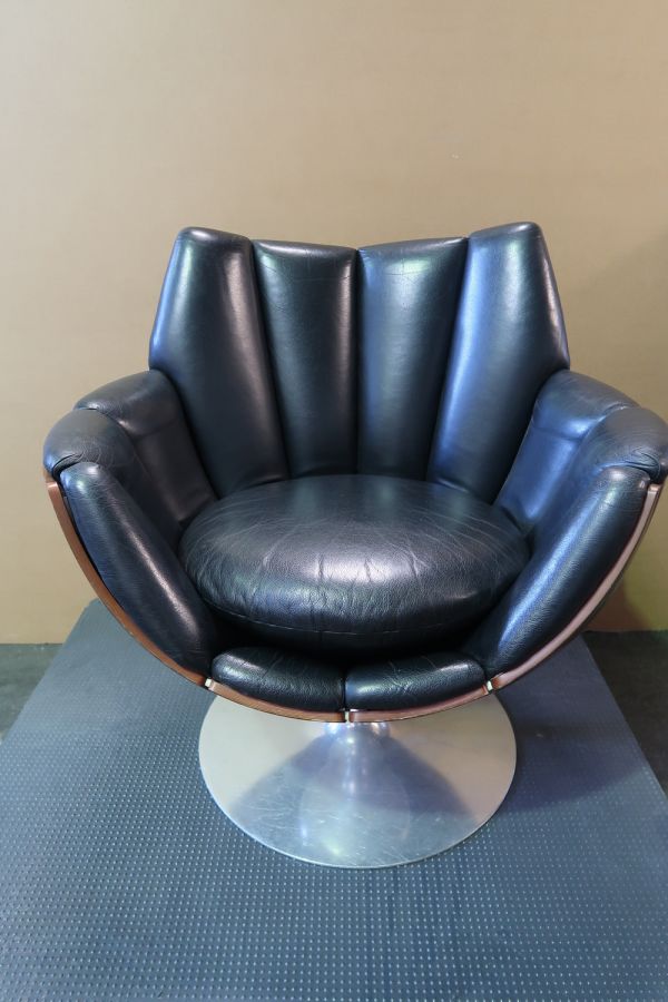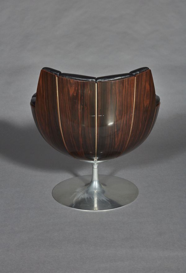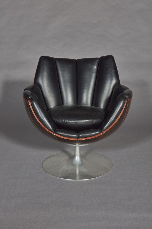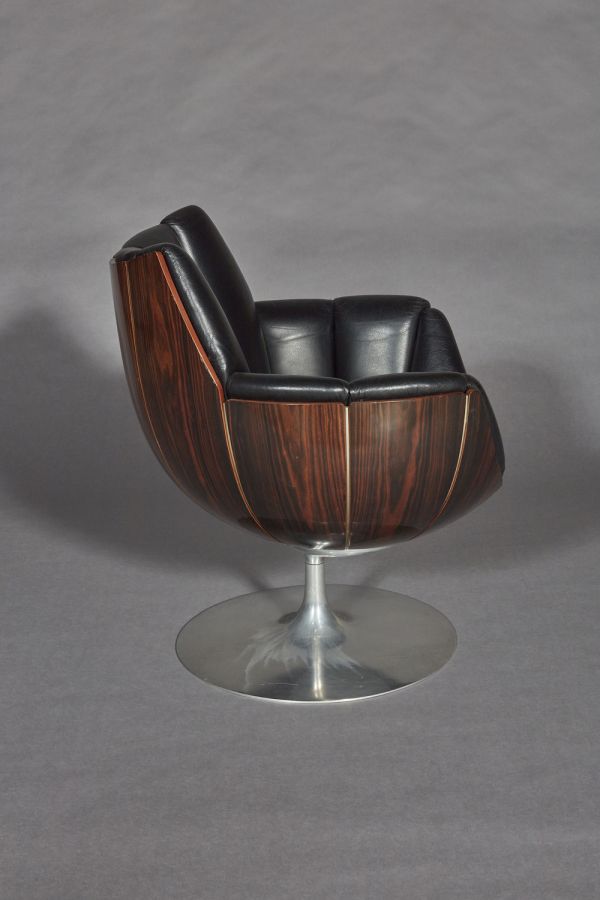 Socle circulaire en acier inoxydable d'où part au centre un fût cylindrique supportant le siège en forme de corolle composé de douze éléments en contreplaqué moulé couvert ébène de macassar assemblés entre eux par des profilés en aluminium. Coussin d'assise circulaire couvert de cuir noir sur mousse de latex.