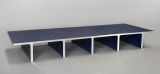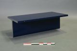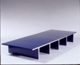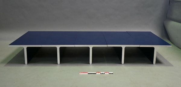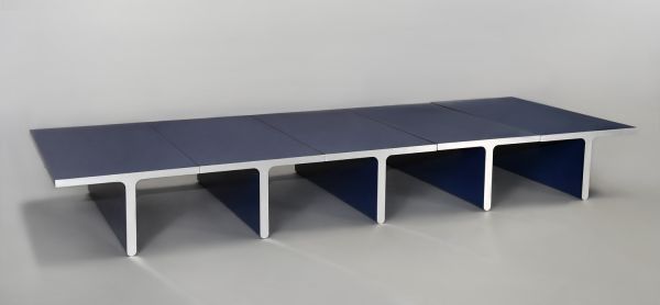 Table basse composée de cinq éléments en forme de "T" revêtus de lamifié bleu nuit formé. Les deux chants d'extrémité sont en acier inoxydable mat. Les éléments sont t reliés entre eux par une traverse métallique vissées sur le dessous.
