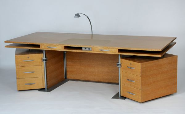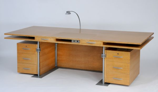 4 pieds en tube d'acier chromé, décorés dans leur partie supérieure par 3 petits disques de verre épais superposés. 2 caissons (1 à droite, 1 gauche) chacun ouvrant 3 tiroirs pivotent sur 2 des pieds, auxquels ils sont reliés par des charnières. Plan de travail dégagé, composé de 2 plaques de chêne superposées, comportant dans l'intervalle ainsi crée, 2 petits tiroirs encadrant une cavité centrale de rangement. Façade pleine en chêne cérusé.