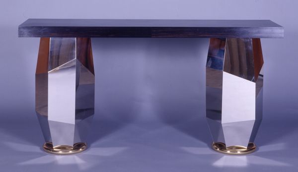 La table basse interprète plus globalement ce motif du cercle : il devient la table elle-même et n'est employécomme décor qu'à la jonction des pieds. La console se singularise dans cet ensemble: on retrouve le cercle modestement réduit à la fonction de base doré pour des pieds robustes. Fortins élégants, traités en facettes d'alu chromé, brillants comme des miroirs, ces pieds sont le support majestueux du plateau noir d'ébène. Dorure à la feuille, or blanc, ébène et velours de soie, les créateurs ont conjugué la noblesse des matériaux dans un registre luxueux dont ils possèdent la totale maîtrise.