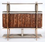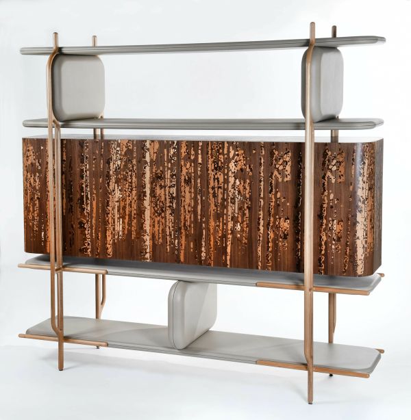 Bibliothèque en cuir de vache beige (marque Stolz, gamme select n° 112), noyer blond massif, marqueterie en noyer blanc français, noyer et loupe de noyer US, contre-plaqué okoumé, nid d'abeille polypropylène (âme des étagères). Finitions vernis polyuréthane acrylique mat et gainage cuir.