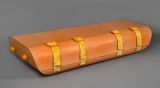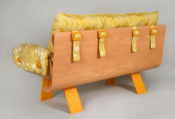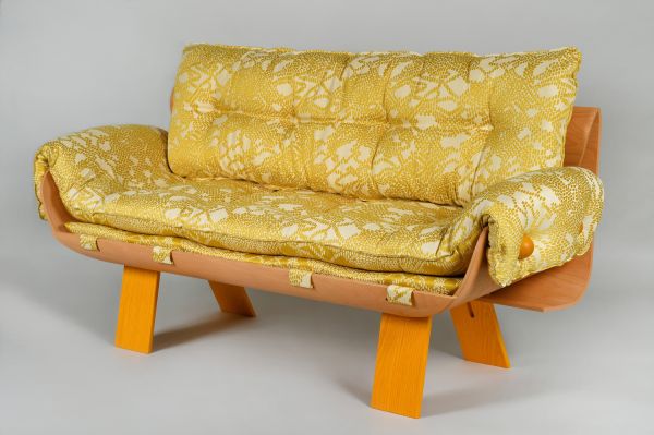 Canapé de voyage modulable en frêne (pieds et poignées en frêne massif, structure en contre-plaqué moulé en feuille de frêne) huilé avec deux teintes de la société Rubio Monocoat. En position fermée, il est retenu par des sangles élastiques en polyester « bouton d’or » de SCF. Le garnissage a été réalisé par la société Le Lit National dans le cadre d’un mécénat de compétence. L’assise est recouverte d’une housse en viscose et coton, couleur Mimosa. Il s’agit d’un textile présentant des blés battus pas le vent, dessiné spécialement par le studio Marcel Poulain et édité chez Le Manac’h sous le nom « A travers champs ».