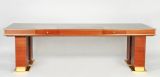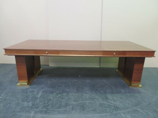 Quatre piétements rectangulaires bronze avec agrafe portant 4 socles à face concave formant pieds orné d'un centre à motif bronze avec la croix de la libération. 2 tiroirs à clef dans la ceinture. Dessus plein marqueté avec baguettes et listels bronze doré dans la ceinture unie ; le centre gainé maroquin marron.