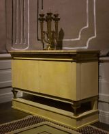 Socle plein rectangulaire surmonté de deux pieds antérieurs bronze, pieds postérieurs droits, listels bronze doré à petit décrochement. Montants pilastre uni ; deux grands vantaux horizontaux à clef. Corniche bronze à l'égyptienne. Dessus marbre brèche mouluré droit, à décrochement.
