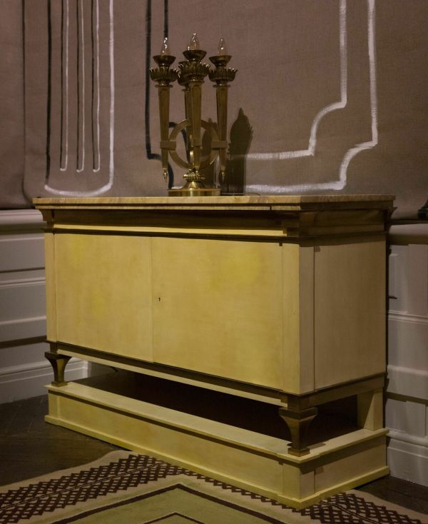 Deux meubles d’appui identiques, en bois laqué ivoire et bronze doré surmontés d’un plateau en marbre brèche font partie de cette commande adressée par la Mobilier national à André Arbus le 16 août 1945.