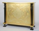 Quatre pieds toupie en métal noir sur platine carrée, montants antérieurs tournés métal en gaine, avec au sommet des bustes féminins en caryatide, portant des chapiteaux en cône séparés du dessus du meuble par une platine carrée, et accolés au corps de meuble échancré pour leur logement. Le reste du coffre rectiligne avec porte abattante sur laquelle sont montés des casiers à plan, à la face en marqueterie d'or plusieurs tons. Dessus saillant et rectiligne.
