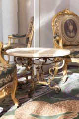 Piétement formé de quatre consoles à volutes haut et bas, la supérieure beaucoup plus grosse, sur quatre platines en douche réunies par deux traverses en croix, avec au centre une balustre de section carrée surmontée d'une vasque en douche. Les volutes supérieures réunies par une corde molle. Dessus à congé de marbre blanc et rose aurore.