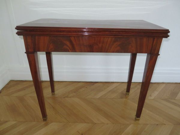4 pieds carrés en gaine, sabot bronze mouluré sommet à moulure saillante. Ceinture unie, ouvrante en tiroir avec 2 pieds, dés saillants. Dessus plein champs à listel central arrondi, ouvrant et gainé drap vert à frise excurvée.