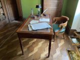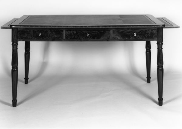 Versement de la présidence de la République, palais de l'Elysée, 55 du Faubourg-Saint-Honoré, Paris 8e arr., au Mobilier national, le 14 octobre 1949 : "1 table à écrire en acajou verni, ouvrant à 3 tiroirs dans la ceinture, pieds tournés moulurés à double poire, dessus gainé à frise muni de 2 tablettes tirantes" (registre d'inventaire des meubles de menuiserie et d'ébénisterie, vol. 4, p. 248, GME 10971).