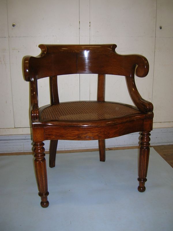 Pieds antérieurs tournés, godronnés ; pieds postérieurs sabre. Devanture en doucine. Siège demi-circulaire. Supports d'accotoirs en cavet et grosse volute se raccordant au dossier demi-circulaire, fronton déversé, fond canné. Coussin galette moleskine chagrin verte