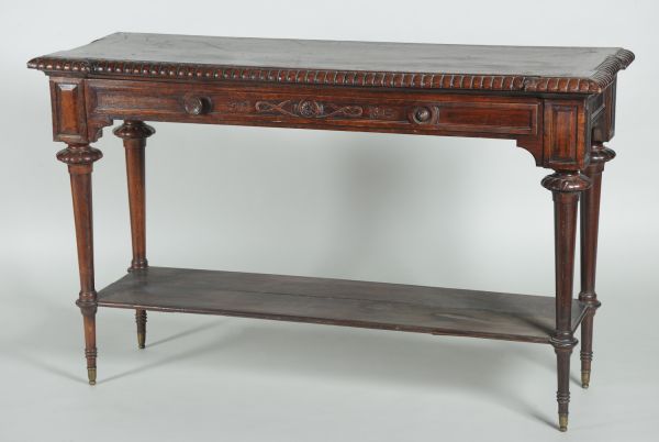 4 montants formant pieds tournés en gaine fine, sommet en grosse bague à godrons et bague unie saillante aux angles de la tablette à champs moulurés. Ceinture rectangulaire à frise moulurée en encadrement, gros dés saillants moulurés et à écoinçons concaves raccordés à la ceinture et au tiroir de toute longueur. 2 boutons bois tourné, centre sculpté. Dessus plein saillant mouluré et larges godrons, angles saillants et corniche moulurée.