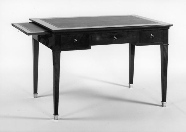 4 pieds carrés en gaine prolongés en dés saillants, sabot bronze mouluré. Ceinture unie. 3 tiroirs; entrée à gros filet, le central plus long et plus étroit. Dessus saillant champs nervés et arrondi en corniche, gainage chèvre verte comme les 2 tirettes. Bouton bronze.
