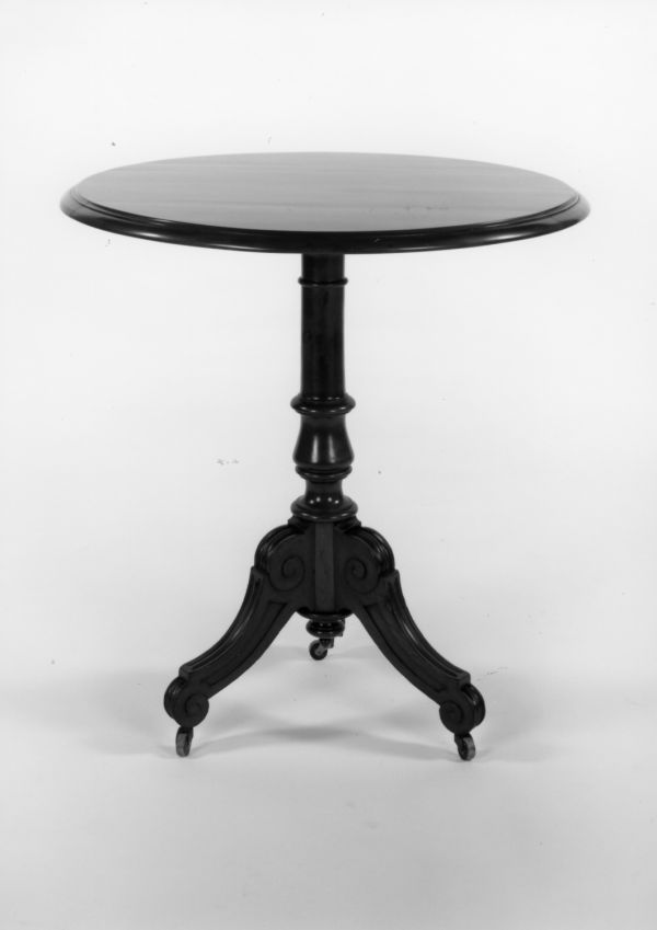 - Trois pieds console en cavet extrémités à rouleau dessus mouluré côtés à fond creux et volutes (sur roulettes). Fût tourné base à nombreux profils sommet en gaine. Dessus plein circulaire mouluré.