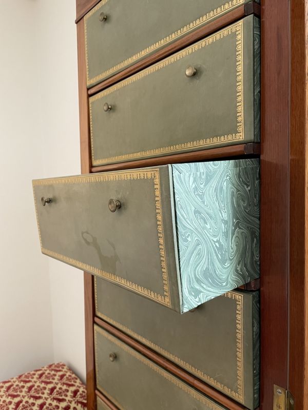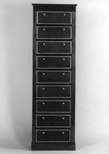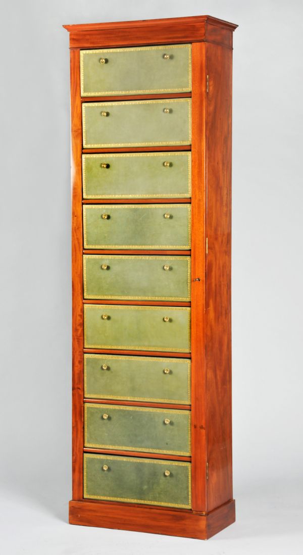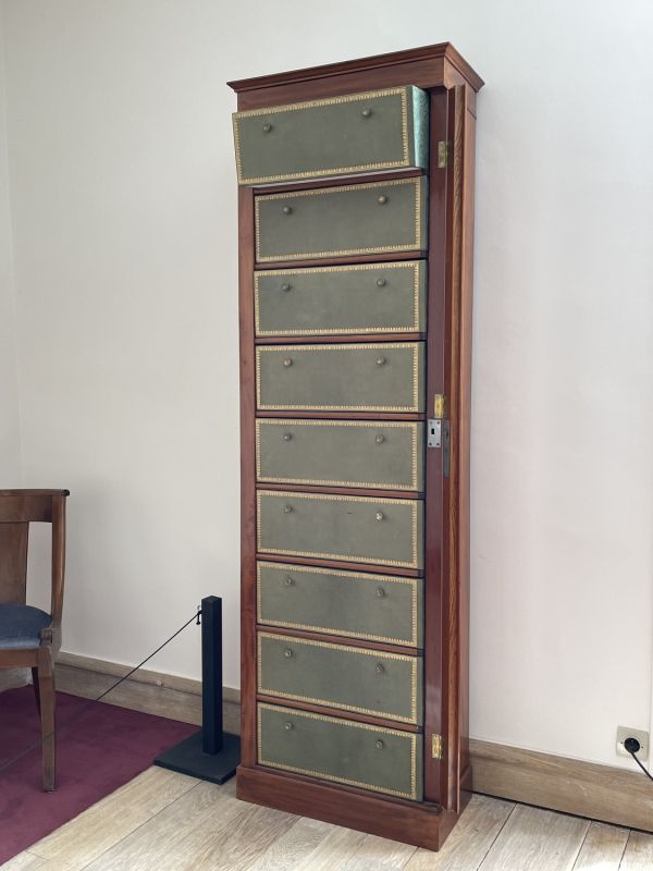 En façade, neuf cartons couverts de moleskine bordé d'une frise dorée et à deux poignées circulaires chacun, entre des tablettes à champ arrondi.