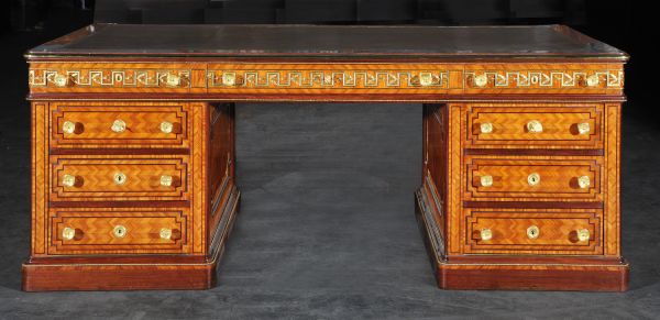 Deux coffres pleins - trois tiroirs fermant à clé - boutons ciselés - supportant la ceinture à trois tiroirs fermant à clé, ornés de motifs à la grecque et lauriers - dessus gainé à frise maroquin noir - deux tablettes tirantes face postérieure, deux panneaux ouvrant sur casiers avec tablettes - filets, ornements de cuivre et perles.