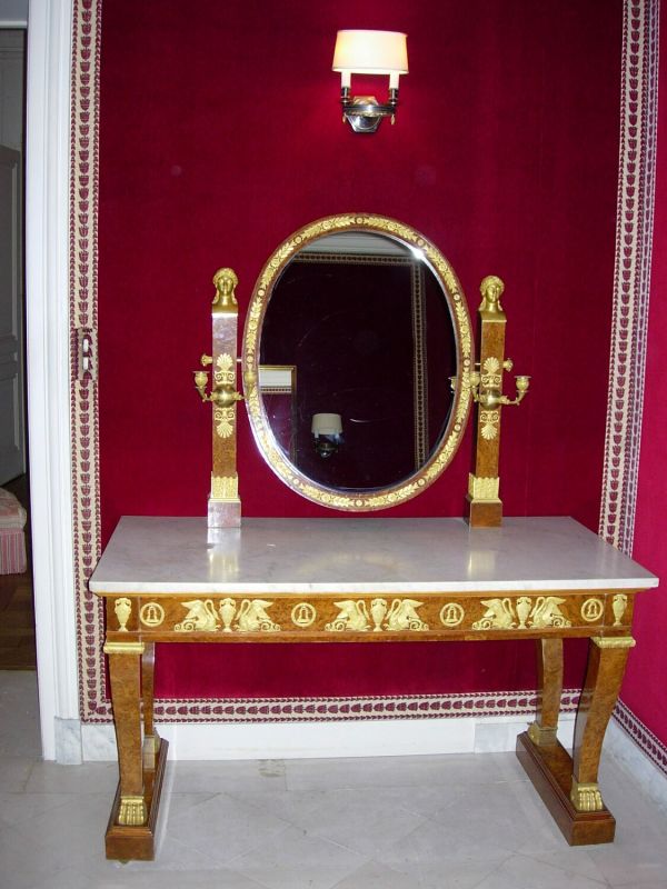 Pieds en doucine à sabots bronze doré, sur 2 patins rectangulaires. Ceinture rectiligne, un tiroir à chaque extrémité à mouvement automatique. Dessus marbre blanc, glace ovale avec 2 bras de lumière à 2 lumières chacun. Appliques bronze : cygnes, amphores, couronnes.