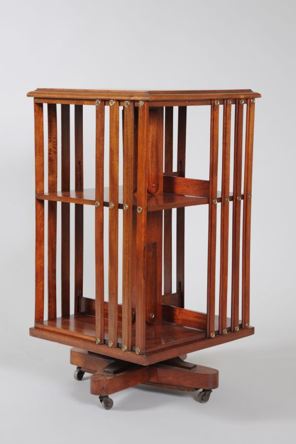 - Bibliothèque tournante, acajou ciré. Début XXème siècle. Piétement en croix sur roulettes. Coffre rectiligne à une tablette intermédiaire et côtés à barres verticales sur un tiers de la largeur. (EN 11019).