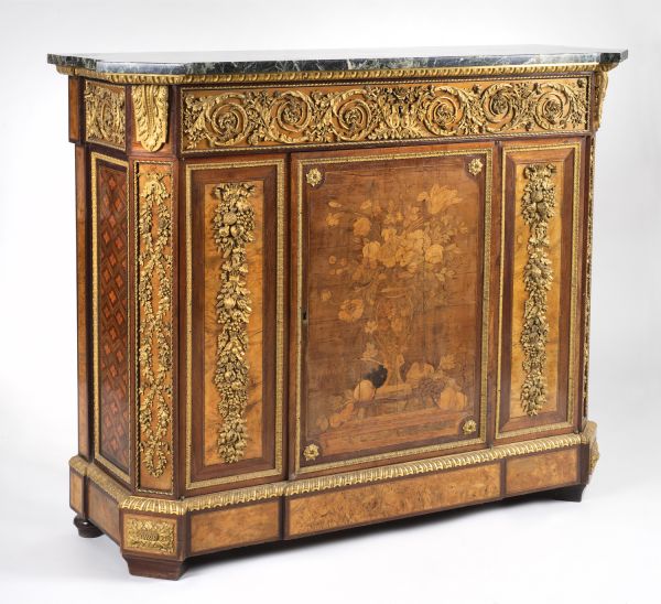 Montants rectilignes saillants, les antérieurs en pan coupé à fond creux garni d'un entrelac de deux guirlandes fleuries en applique de bronze doré. Côtés marquetés de rosaces dans des losanges ; encadrement de moulures de bronze doré. Face en trois panneaux : le central plus large et saillant marqueté d'un vase fleuri avec fruits à son pied ; les deux autres figurant une chute de quatre groupes de fruits enrubannés en bronze doré sur toute la hauteur. Même moulure d'encadrement que sur les côtés. Ces trois panneaux forment trois portes, la centrale se rabattant sur la droite.