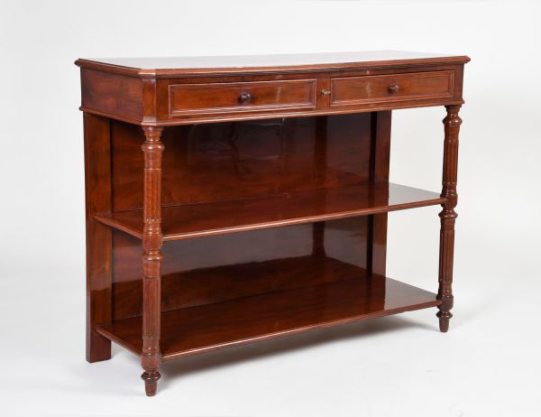 2 montants antérieurs tournés cannelés, postérieurs droits pilastres. 2 tablettes d'entrejambe à ord demi-jonc panneau à fond uni. 2 tiroirs dans la ceinture encadrés moulures et pans coupés. Dessus plein mouluré.