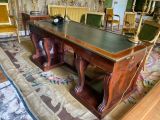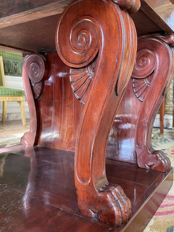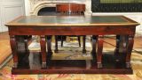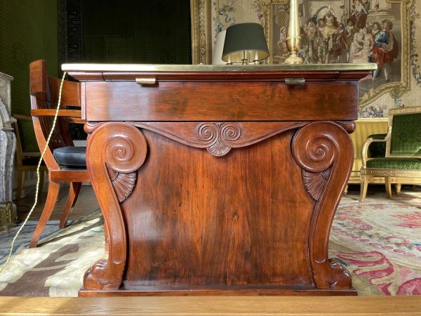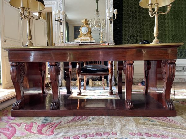 Socle uni rectiligne évidé au centre. 8 pieds en doucine (2 groupes de 4) sabot griffes de lion, sommet à rouleau sur palmettes fond creux face et côtés, terminé en volutes et feuille d'eau à rouleau. Ceinture unie, sur tablier de côté chantourné en double doucine à volutes sur palmette. Panneau latéral entre pieds 2 tiroirs saillants, traverse centrale évidée en doucine, entrée à filet. Corniche en doucine. Dessus saillant, gainé chèvre verte à vignettes comme les 2 tirettes en bout.