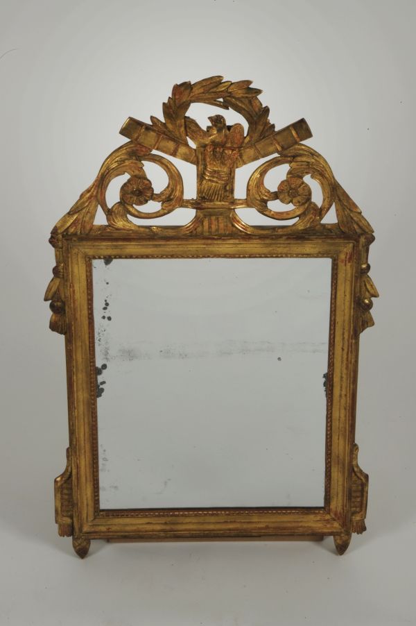 - Glace argentée dans cadre rectangulaire doré en moulure unie après rang de perles. Base à deux montants carrés et petite console latérale cannelée. Au sommet, décor ajouré en 2 rinceaux en volute retombant sur les côtés et de chaque côté d'une gerbe de blé portant un oiseau dans une couronne de laurier.