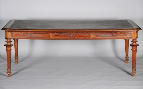 4 pieds tournés à grosses bagues, fût en gaine cannelé. Ceinture rectangulaire à petite moulure saillante à la base, dés saillants à 1/4 de rond rentré ; 3 tiroirs égaux encadrés moulure saillante, entrée à filet. Dessus moulure en bec de corbin saillant à coins ronds gainé moleskine nègre.