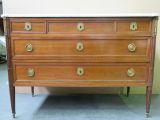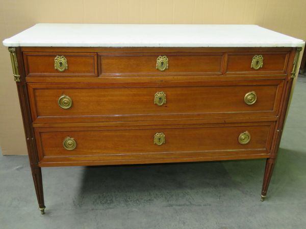 4 pieds tournés cannelés effilés à sabot cuivre. Montants encastrés 3/4 et cannelés. 2 tiroirs à clef avec 4 anneaux de tirage perlés. 3 tiroirs à clef dans la ceinture. 4 entrées en cartouche ovale à perles, encadrement moulure bois
