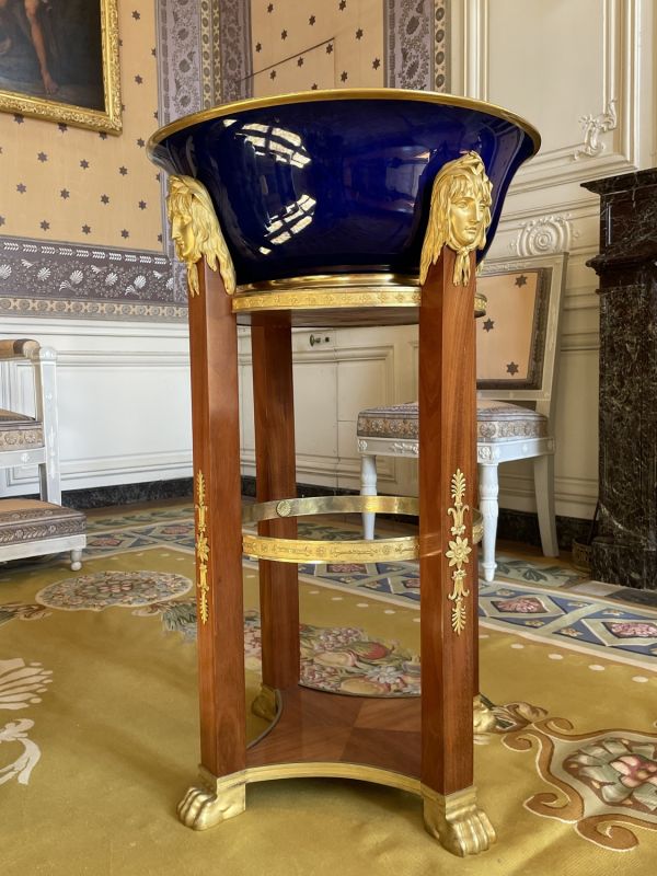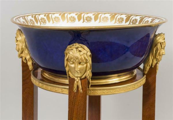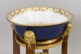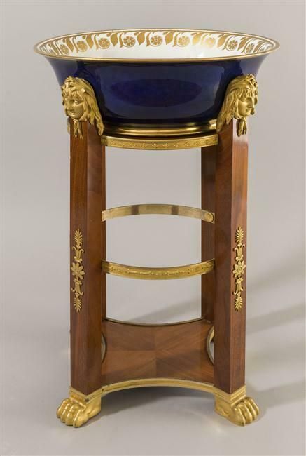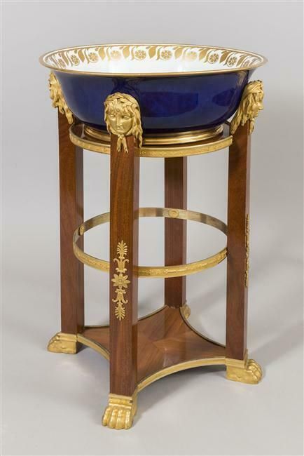 Pieds à griffes et têtes allégoriques en bronze ciselé doré, montants carrés, tablettes quadrangulaire par le bas, ronde par le haut ciselé en bronze doré. Cuvette en porcelaine de Sèvres.